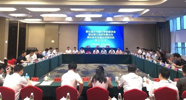 9月14日上午,“新化县乡村振兴专家座谈会暨全域土地综合整治与高标准农田建设”招商引资项目合同签约仪式在新化隆重举行。新化县委副书记、县长左志峰主持签约仪式,国内农业领域各知名专家、市直相关部门、市创业发展集团、新化县委县政府及县直部门主要负责人出席签约仪式。创发集团董事长刘建、总经理阳文林与新化县委书记朱前明、新化县委副书记、县长左志峰、县委副书记周海强、全国人大代表、湖南省知识分子联谊会会长、湖南省战略咨询委员会委员、中国科学院大学农学院副院长、中科院亚热带农业生态所首席研究员吴金水、首都金融服务商会监事长孙莉、市农发行行长袁军民、市农业农村局总农艺师唐正伟共同见证了市创发集团文旅投公司和长沙路桥组成的联合体与新化县政府的签约过程。本次活动的举办,标志着新化县全域土地整治与高标准农田建设项目正式进入实施阶段。